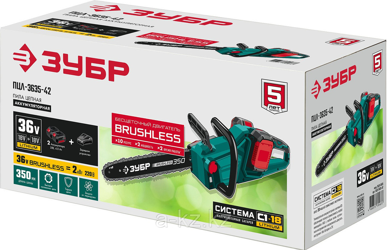 ЗУБР С1-18, 36 В, 35 см шина, 2х18 В АКБ (4 А·ч), бесщеточная цепная пила (ПЦЛ-3635-42)