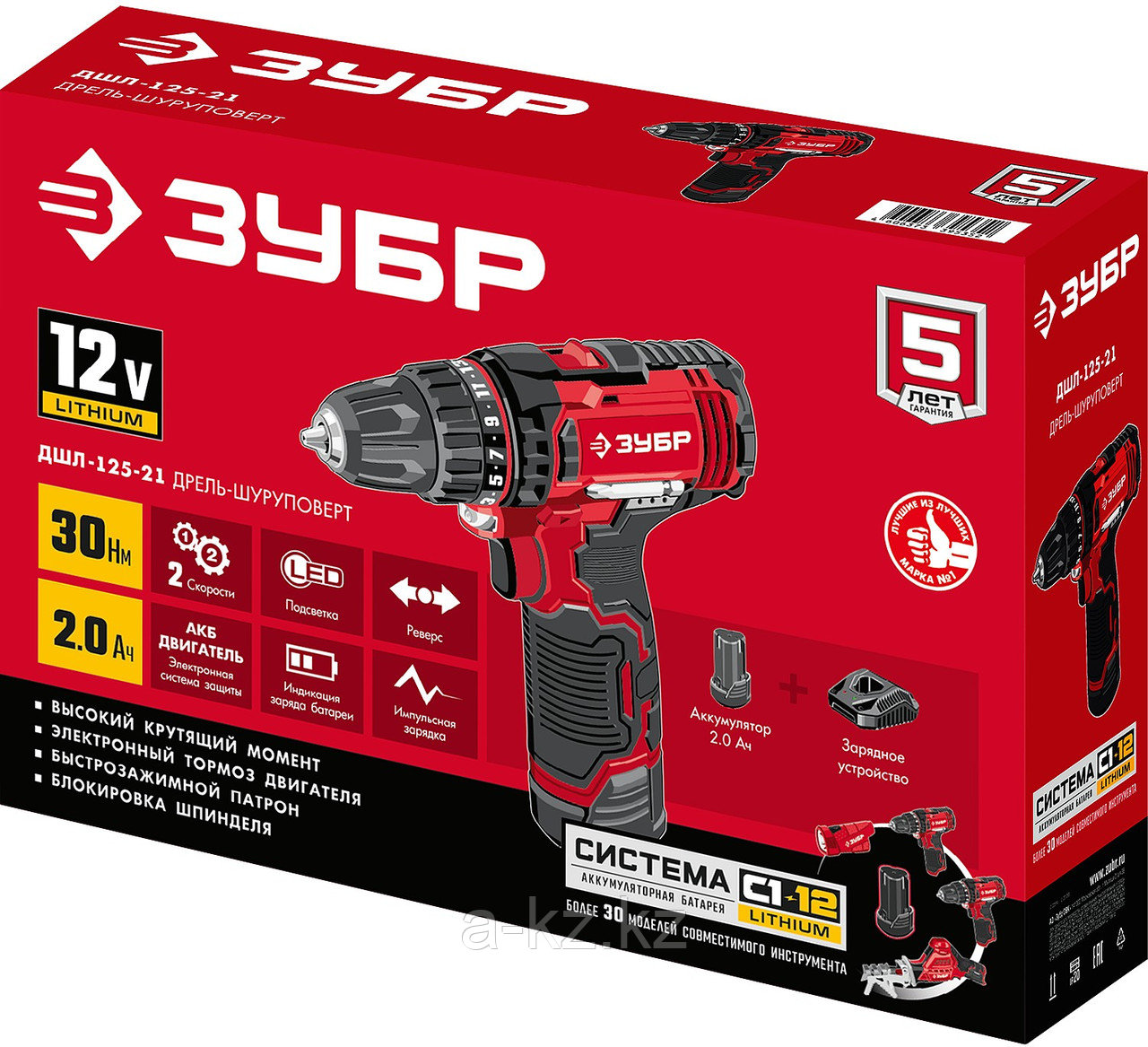 ЗУБР С1-12, 12 В, 30 Н·м, 1 АКБ (2 А·ч), дрель-шуруповерт (ДШЛ-125-21)