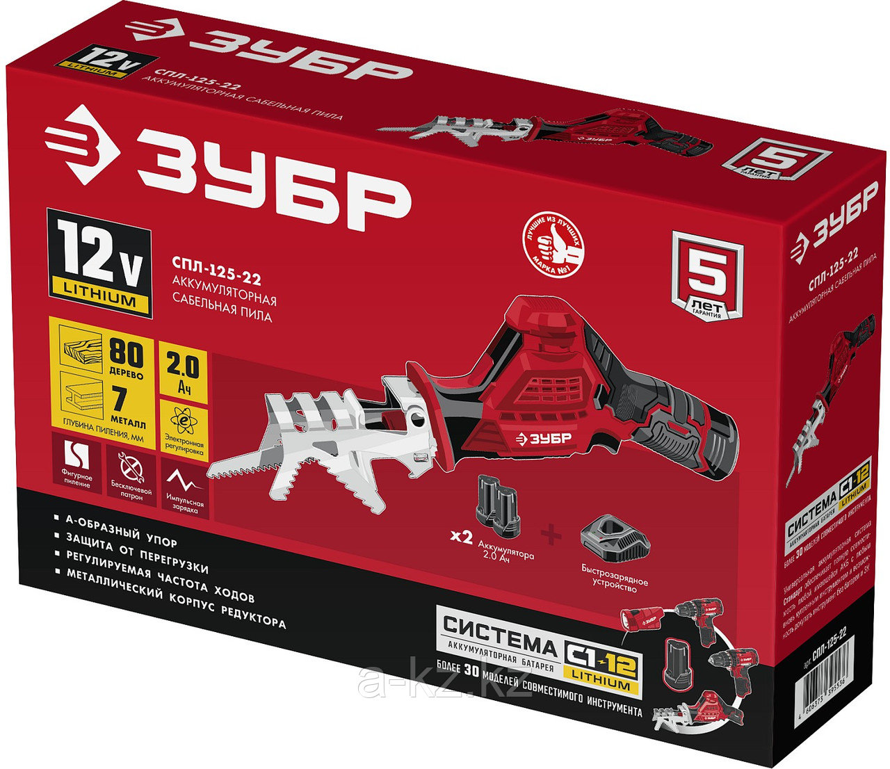 ЗУБР С1-12, 12 В, 80 мм, 2 АКБ (2 А·ч), сабельная пила (СПЛ-125-22)